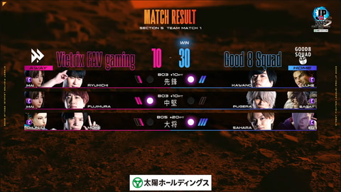 先鋒戦は、りゅうきちの舞とカワノのルークの1戦だが、ここはカワノのルークが2-1で勝利し、Good 8 Squadが先制の10ポイントを獲得した。