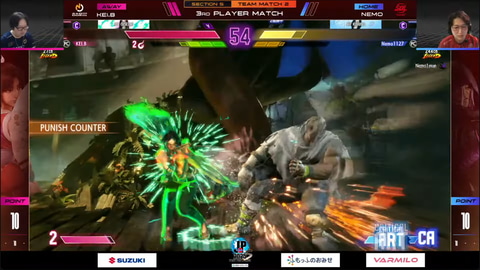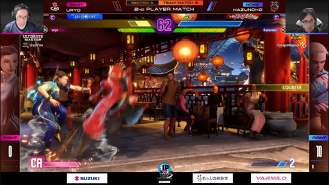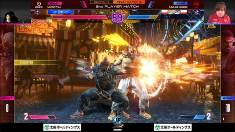 先鋒戦、こばやんのザンギエフとSeiyaの春麗の1戦は2-0でこばやんのザンギエフが勝利。続く中堅戦はまちゃぼーのリュウともっちーの豪鬼の1戦だが、ここはもっちーの豪鬼が2-1で勝利。チームとしては10-10の同点となり、大将戦がチームの勝敗を決する展開となった。