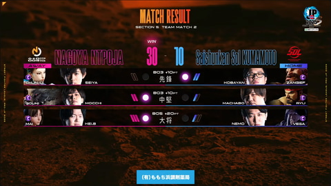 大将戦となるネモのベガとKEI.Bの舞の1戦は、ここまで全勝を続けているKEI.Bの舞の勢いが止まらず、今宵も好調な動きを見せて、3-1でKEI.Bの舞が勝利。チームとしては名古屋NTPOJAが30-10でSaishunkan SOL熊本に勝利する結末となった。