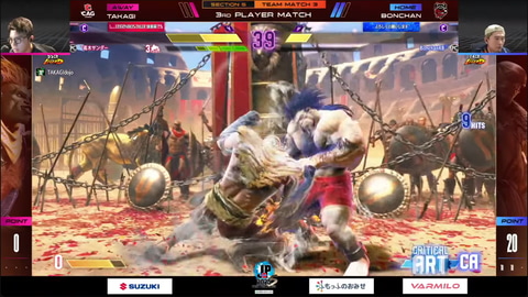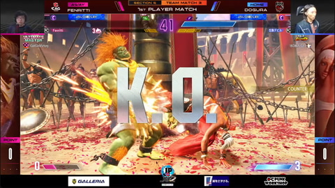大将戦、ボンちゃんのサガットと高木のブランカの1戦は、高木が取ればボンちゃんも取るといった一進一退の攻防が続く。3セット目にボンちゃんサガットが2-1としてリーチをかけるも、インターバルは入れずにそのまま試合が続いた。4セット目はボンちゃんサガットが先制し、2ラウンド目もここで勝てば決まりという緊迫した状況下となったものの、高木のブランカが意地を見せて、なんとミリの体力から逆転!しかし、最終ラウンドではギリギリの対決を制したボンちゃんのサガットが勝ち切り、3-1で大将戦を制した。