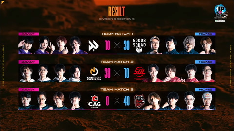第5節を終えて、Division Sは勝利したGood 8 Squadが変わらずの単独トップだ。しかし、2~4位の3チームは同ポイントでほぼ横並びだった。その中から、Crazy Raccoonが40ポイント稼いで一気に単独2位に浮上した。同ポイント同士の直接対決を制した名古屋NTPOJAが単独で3位、そこで敗れたSaishunkan SOL熊本が4位に落ちることとなり、大激戦ながら少しずつ差が出始めているようにも感じられる。