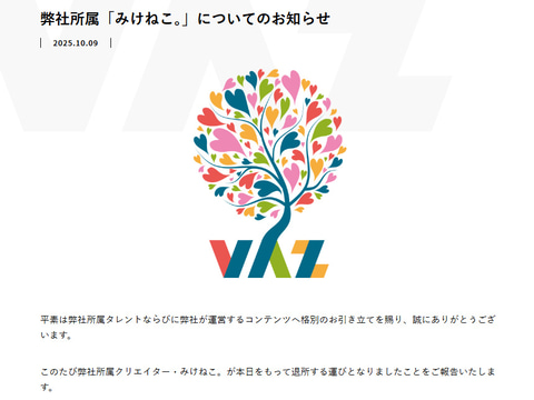 VAZは、同社所属のVTuberみけねこ。さんが10月9日をもって退所したと発表した。みけねこ。さん側から心身の健康上の事情などの相談があり、慎重に協議を重ねた結果、双方が合意の上で円満に退所するに至ったとしている。