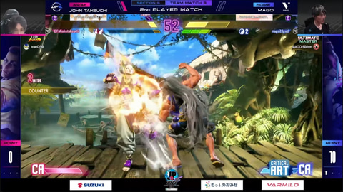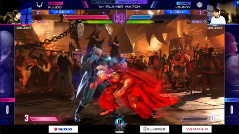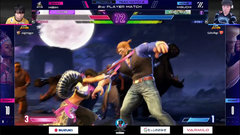 先鋒戦、水派の舞とGO1の春麗の1戦は、今期リーグでは初となる水派の舞が好調な立ち回りを見せて、初投入ながら2-0でGO1を抑えて勝利。続く中堅戦、マゴのジュリと竹内ジョンのジェイミーの1戦は、竹内ジョンが見事な立ち回りを見せて2-0勝利で、チームとしてはVARREL、DetonatioN FocusMeともに10ポイントとなり、大将戦に勝敗を委ねる展開となった。
