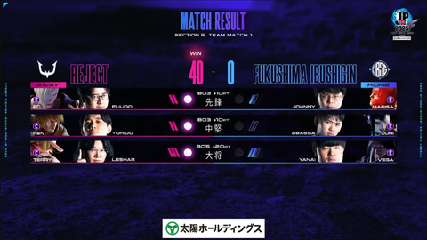 この大将戦の勝利により、試合としてはREJECTがFUKUSHIMA IBUSHIGIN相手に40-0の完封勝利を決めた。