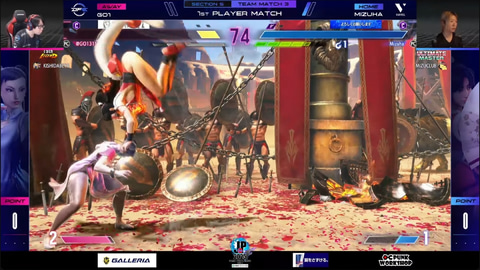 大将戦はあでりいのエドとひかるのA.K.I.の1戦。あでりいのエドが1セット先取すれば、ひかるのA.K.I.が取り返す一進一退の攻防が展開し、フルセットまでもつれ込んだ激闘の結末は、ひかるのA.K.I.が巻き返して3-2で勝利。本来なら延長戦が発生するところだが、翔不在で不戦敗のため、試合は30-20で広島TEAM iXAがZETA DIVISION Geeklyに勝利することとなった。