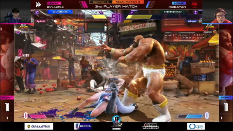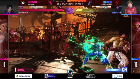 先鋒戦、ネモのベガとsakoのエレナの1戦は、ネモのベガが2-1で先制。続く中堅戦、まちゃぼーのリュウともけの春麗の1戦は接戦ながら、もけの春麗が2-1でまちゃぼーのリュウに勝利。10-10に追いつく展開となった。
