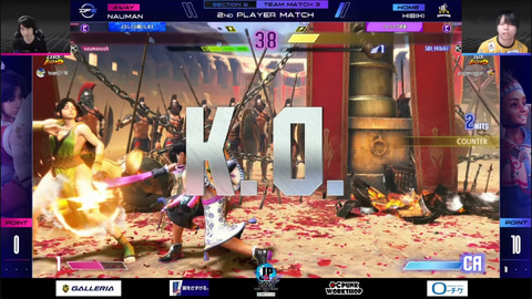 先鋒戦はひかるのA.K.I.とふ~どのエドの1戦で、ひかるのA.K.I.がふ~どのエド対策を見せて1セットを先制するも、対策への対応がスムーズなふ~どのエドが反撃し、2-1の逆転勝利でふ~どのエドが勝利。続く中堅戦、ひぐちのガイルとウメハラの豪鬼の1戦は、ひぐちのガイルの気合いの入った攻めが通り、2-0でウメハラの豪鬼を撃破。ポイントとしては10-10の同点となった。
