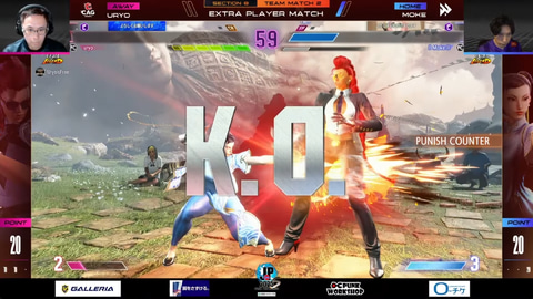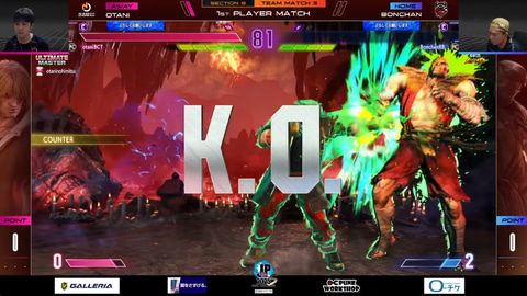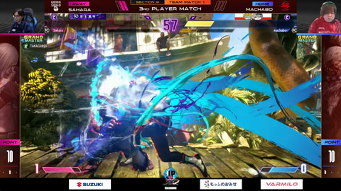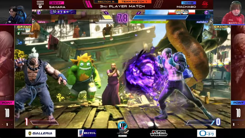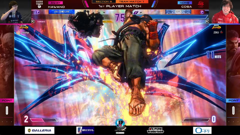 先鋒戦、cosaのリュウとカワノの豪鬼による1戦はcosaのリュウがカワノの豪鬼を上回る立ち回りを見せて、2-1で勝利。続く中堅戦はこばやんのザンギエフとぷげらのベガの1戦で、ここはこばやんのザンギエフへの対応が万全だったぷげらが2-0で勝利し、チームとしてのポイントは10-10で並ぶ展開となった。