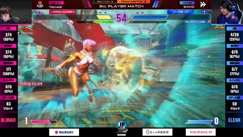 MATCH2はホームがVictrix FAV gaming、アウェイがCAG OSAKAの1戦。アウェイ側となるCAG OSAKAのオーダーは先鋒にフェンりっちのブランカ、中堅はえいたの豪鬼、大将は高木のブランカ、リザーブはうりょのヴァイパーとなった。対するVictrix FAV gamingのオーダーは先鋒がりゅうきちの舞、中堅は藤村のヴァイパー、大将はsakoのエレナ、リザーブはもけの春麗だ。