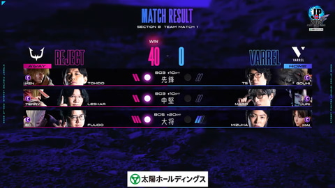 試合としてはREJECTがVARRELに対して40-0で完封勝利を収める形となった。
