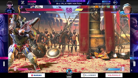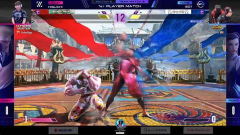 先鋒戦はGO1の春麗とひぐちのガイルの1戦で、ここはGO1の春麗がひぐちのガイルを抑えて2-0で先制。続く中堅戦、板橋ザンギエフのザンギエフとひかるのA.K.I.の1戦は、ひかるのA.K.I.の慎重な攻めに対して、板橋ザンギエフが果敢な攻めと読み合いで粘りを見せる。ギリギリの攻防が展開したが、最後はひかるの読みが上回り、2-1で勝利する結果となった。