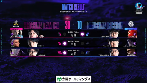 結果は広島TEAM iXAが30-10でFUKUSHIMA IBUSHIGINに勝利することとなった。
