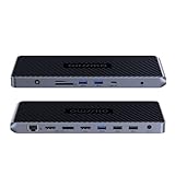 本製品は、電源アダプタで動作するセルフパワー型のドッキングステーションだ。USB Type-C(ホスト接続用、給電は非対応)、USB 3.0 Type-C(最大20WのUSB PD出力に対応)、USB 3.0×3、USB 2.0×2、HDMI×2、DisplayPort、Gigabit Ethernet、microSD/SDカードスロット、音声入出力を搭載する。