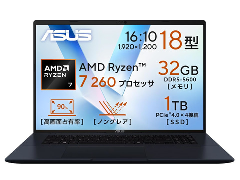 Vivobook 18 M1807HAは、ディスプレイに18型液晶(最大144Hz駆動、1,920×1,200ドット)、CPUにRyzen 7 260、メモリに32GB DDR5、ストレージに1TB SSD、OSにWindows 11 Homeを搭載するノートPCだ。バッテリ寿命を延ばすとするバッテリヘルスマネジメント機能を装備。米国MIL規格およびASUS独自の耐久テストをクリアする高い堅牢性を備える。