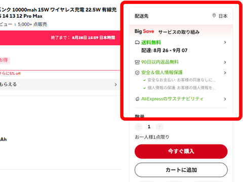 Big Save対象の製品はAliExpressのトップページの「本日のセール」などから確認可能。一例として挙げると、Qi2のワイヤレス充電に対応し、マグネットでiPhoneなどに貼り付け可能なBaseusのモバイルバッテリ「Airpow II」が、6,157円オフの6,358円で販売されている。Big Save対象かどうかは、ページ右から確認可能だ。