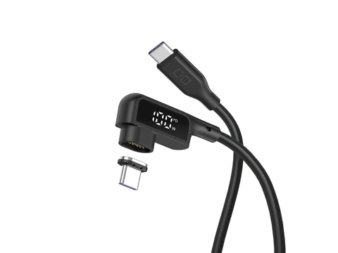 本製品は、最大100WのUSB PD、480Mbpsの転送速度に対応するUSB Type-Cケーブル。片側はL字型コネクタを搭載。端子部分はマグネット式となっており、簡単に着脱できるのが特徴だ。また、出力W数をリアルタイム表示する液晶ディスプレイを備える。30,000回の折り曲げテストをクリアする高耐久シリコンケーブルを採用。