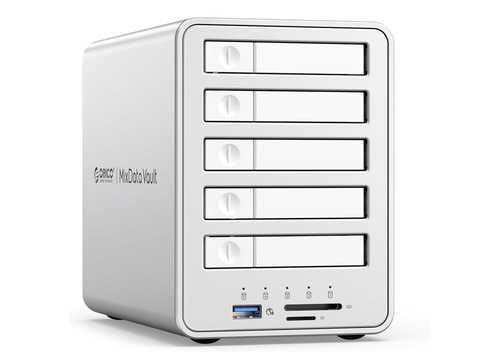 本機は、USB 3.2 Gen 2接続の外付けSSDケース。5基の2.5インチドライブベイを搭載し、最大合計40TB(8TB 5基)のSATA SSD/HDDをサポートする。ドライブ構成は、Clear/Span/RAID 0/1/3/5/10に対応。USB 3.2 Gen 2 Type-C、USB 3.2 Gen 2、およびmicroSD/SDカードスロットも備える。