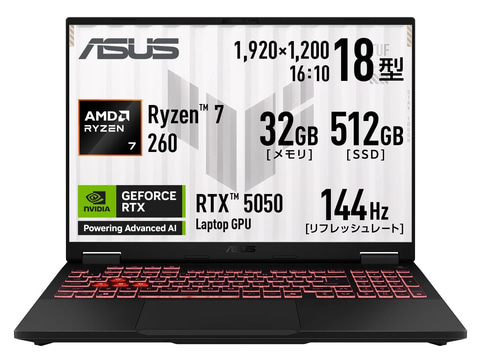 TUF Gaming A18 FA808UHは、大画面を備えるゲーミングノートPCだ。主な仕様は、ディスプレイが18型液晶(最大144Hz駆動、1,920×1,200ドット)、CPUがRyzen 7 260、GPUがGeForce RTX 5050 Laptop GPU、メモリが32GB DDR5、ストレージが512GB SSD、OSがWindows 11 Home。2,000万回の打鍵テストに耐える高耐久フルサイズキーボードを搭載する。