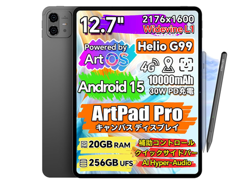 ArtPad Proは、ディスプレイに12.7型液晶(2,176×1,600ドット)、SoCにMediaTek Helio G99、メモリに8GB、ストレージに256GB、OSにAndroid 15を搭載するタブレット。メモリは最大20GBまで仮想的に拡張可能。モードの切り替えやアプリの起動などを行なえる、カスタマイズ可能なSmartボタンを備える。また、4G LTE通信に対応。「T-Pen」が付属する。