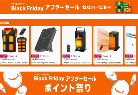 ブラックフライデーセールが終了したAmazonだが、今度は「ブラックフライデーアフターセール」を実施している。期間は12月8日まで。