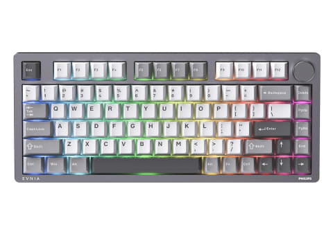 PHILIPS SPK8618は、81キー/75%サイズのゲーミングメカニカルキーボードで、右上には金属製のマルチファンクションノブを搭載する。キースイッチは同社独自開発の抹茶ラテ軸で、押下圧は45g前後。有線/無線接続に両対応し、Bluetooth 5.0接続や付属レシーバーによる2.4GHz無線のほか、USB Type-Cによる有線接続にも対応し、本体背面に備えるスイッチで切り替えが可能。