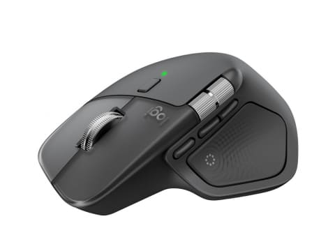 MX MASTER4は、ロジクール製ワイヤレスマウスの最新フラグシップモデル。解像度は最大8,000DPIで、MagSpeed電磁気ホイールや静音スイッチのほか、触覚フィードバック機能なども備える。カスタマイズしたショートカットをワンボタンで起動して呼び出せる「Actions Ring」機能なども利用できる。