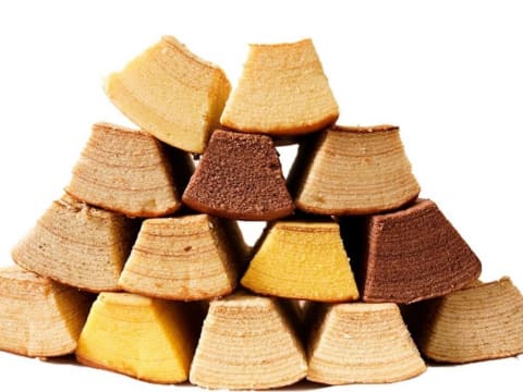 訳ありスティッククーヘン 1kgは、スティック型のバームクーヘンが1kgまとめてセットになったもの。味はバニラやチョコ、バナナ、かぼちゃ、はちみつ、紅茶、メープルの7種類あるが、セットには必ず7種類の味が入っているとは限らず、どの味が入っているかはお楽しみとなっている。