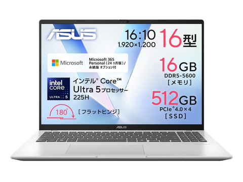 Vivobook 16 X1607CAは、ディスプレイに16型液晶(1,920×1,200ドット)、CPUにCore Ultra 5 225H、メモリに16GB DDR5、ストレージに512GB SSD、OSにWindows 11 Homeを備えるノートPC。207万画素IRカメラを搭載し、Windows Helloの顔認証に対応する。また、バッテリ寿命を延ばすという「バッテリーヘルスマネジメント」機能を備える。Microsoft Office Home & Business 2024が付属。