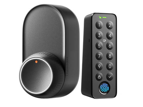 セサミ5 + セサミタッチProは、スマートフォンで鍵の解錠/施錠が行なえるスマートロック「セサミ5」に指紋認証や暗証番号、手持ちのSuicaなどICカードでの解錠に対応する「セサミタッチPro」がセットになったモデル。電源はCR123A電池2本を使用する。同社別売のWi-Fiモジュールなどを併用することで、スマートスピーカーとの連携も行なえる。
