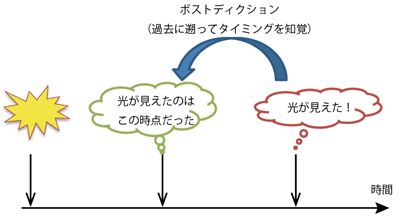光や音に気付いた瞬間と、それらが生じたと感じるタイミングが異なるというのは一見直感に反するが、タイミングの情報を正確に知覚することは情報の統合において不可欠であり、より早い時間に刺激の強度などにあまり依存しないタイミング情報を取得することは、合理的なメカニズムと言える。