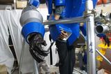 上半身も下半身も、一人で装着することは不可能なので、田中氏や町氏に手伝ってもらいながら装着することになる。上半身のハッチを閉めてしまうと、視界が前後左右のカメラだけになるので、ギュゲスの腕の動きが自分ではよく分からない。そのため、ハッチを開けて操縦を行なったのだが、マスタースレーブの反応はなかなか良く、自分の腕を動かした通りに、ギュゲスの腕が動くのはなかなか楽しい。