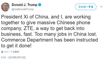 ZTEへの輸出禁止令解除に向け、米トランプ大統領と習主席が協力
