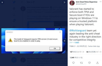 Valorant、チート対策でWindows 11が必須とするTPMを活用か