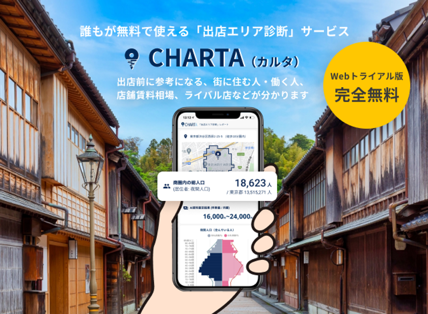 『CHARTA(カルタ)』は、出店場所の検討において力強い味方になるAI診断サービスを提供するもので、店舗の開業を考えている全ての方は無料で利用できます。無料で「店舗賃料AI査定」機能を実装した商圏分析サービスは国内初となります。