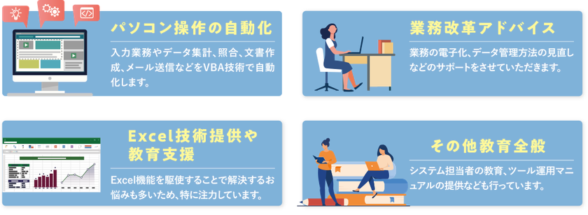 働き方の見直しが必須となっている昨今、定型業務の自動化を図ることで生産性の向上や作業時間の削減を実現する「業務自動化支援事業」を2021年9月1日より新たに開始いたします。業務自動化で有名な「RPA(※1)」と呼ばれる技術ではなく、従来の「VBA(※2)」と呼ばれる技術で業務効率化を支援いたします。VBAでの業務効率化は、ExcelやWordといったこれまで使用しているソフトウェアの使い勝手はそのままに導入することが可能なので、導入後すぐに運用することが可能です。維持費もOffice製品のライセンス費用だけなので、純粋に開発費用だけで導入できることも魅力です。