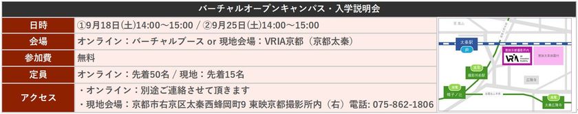 第3期となる10/11(月)開講のAR/VR専門家・起業家育成フルプログラムおよび短期コースのカリキュラム紹介はもちろん、授業の様子や生徒作品の展示、AR/VR市場、エンジニア求人の動向等のご案内も予定しています。全国からオンラインで、または現地会場である東映京都撮影所内のVRイノベーションアカデミー京都から、お気軽にご参加ください。