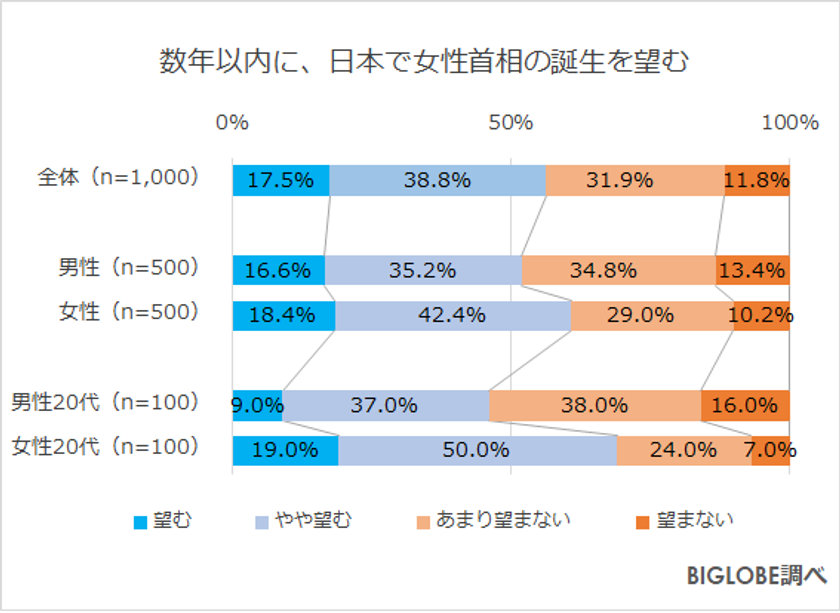 さらに、「数年以内に、日本で女性首相の誕生を望むか」という質問に対し、「望む」(17.5%)、「やや望む」(38.8%)と5割強が女性首相の誕生を望むという結果となった。