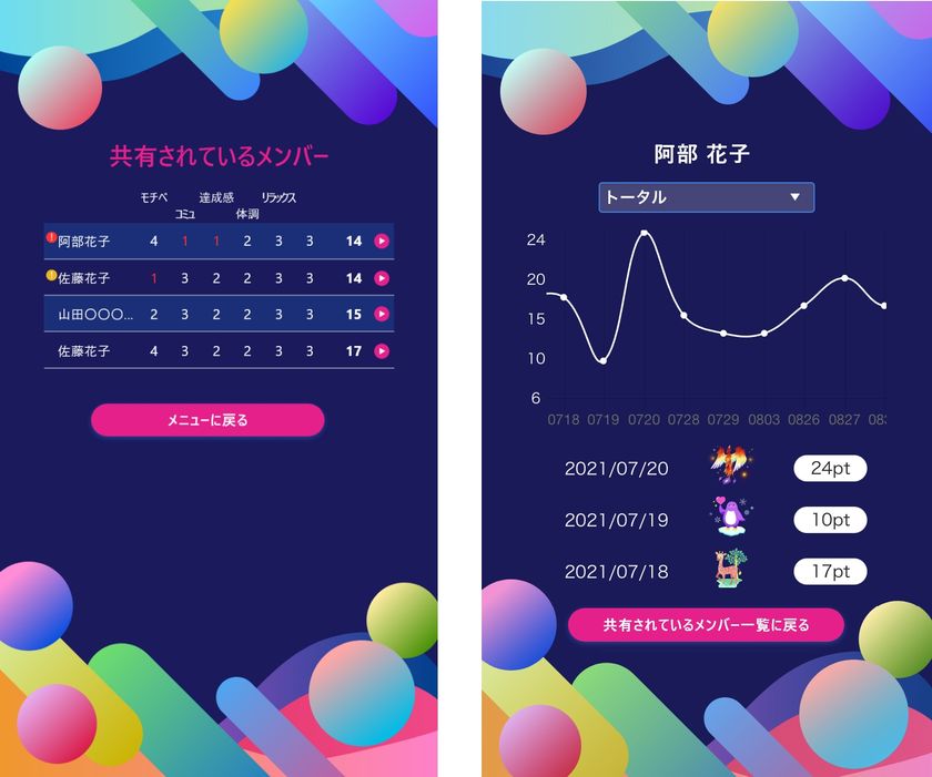 毎日続ければ、心の健康をグラフで表示。モチベーションの上がり下がりなどが一目で分かります。