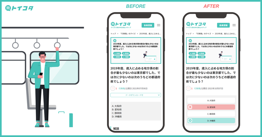株式会社プロネクサスが運営するクイズメディア「トイコタ」は、サービスリリースから約2ヶ月を経て、回答および履歴表示機能を新たに実装しました。「トイコタ」は、現在注目を浴びているデータ活用の視点に気軽に触れられる、ビジネスパーソンを対象にしたクイズメディアです。運営元の株式会社プロネクサスは創業90年を超える歴史をもち、開発・運営を手がけている企業情報・経済統計データベースとそのノウハウから、トイコタの「問い(トイ)」と「答え(コタ)」を制作しています。