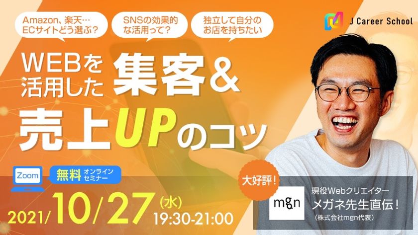 滋慶学園グループのサポート企業である株式会社スーパーモード(本社:東京都江戸川区、代表取締役社長:高山 昌司)が運営する、社会人のキャリアアップを応援するオンラインスクール「J Career School」(ジェイ キャリア スクール)は、「SNSやECサイトなど、WEBを活用した集客&売上UPセミナー」を、2021年10月27日にオンラインにて開催いたします。