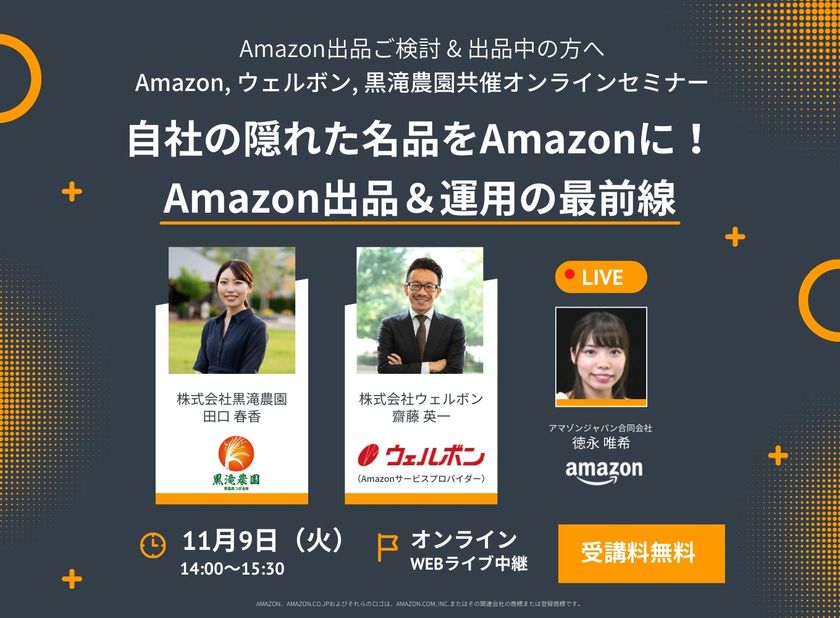 株式会社ウェルボン(所在地:山形県酒田市)は、11月9日(火)、アマゾンジャパン合同会社様(所在地:東京都目黒区)ならびに株式会社黒滝農園様(所在地:青森県つがる市)とオンラインセミナーを共同開催いたします。