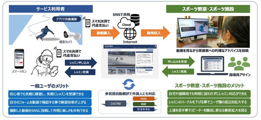 SAVREQは、サービス利用者がスマートフォンの操作により、スポーツ施設に設置したカメラで自分自身を簡単に撮影する事が出来る、AI自動追尾機能*2を備えたクラウド型IoTサービスです。また、撮影した動画をスポーツ教室の指導者に共有して、オンラインレッスンを受講できる機能をご提供します。スポーツ施設、スポーツ教室等の運営団体は、利用者にサービスを提供するための、動画販売管理機能、オンラインレッスン管理機能、オンライン決済による課金機能、及び多言語テキスト変換機能*3をご利用頂く事が出来ます。