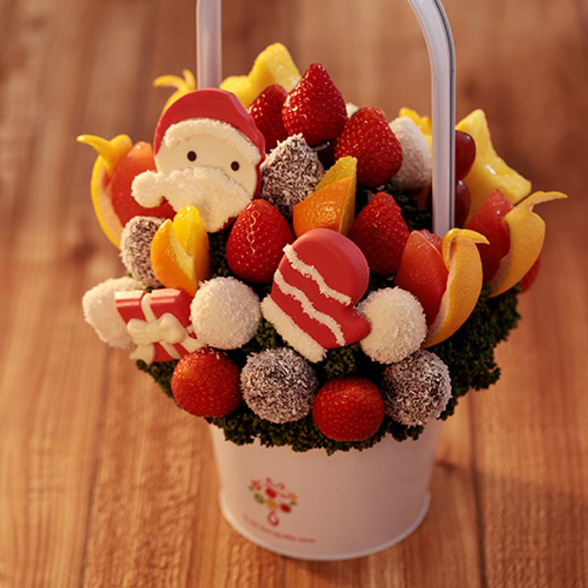 2021年のクリスマス新商品は、フレッシュな国産イチゴとキュートなサンタクロースのチョコレートをアレンジメントしたフルーツブーケです。