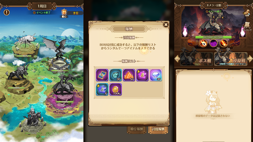 ギルド単位でイベントを行い、魔獣のボスに挑戦します。ボスに与えるダメージに準じて同サーバー内の全ギルドで順位を競います。また、同ギルド内にダメージのランキングもありますので、自分陣営の戦闘力を強化して、より高いダメージを与えることで、豊富な報酬を獲得できます。