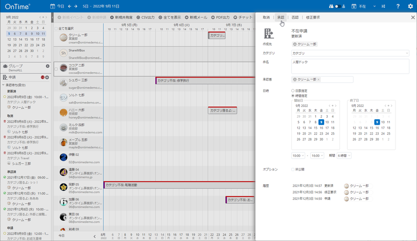 「同 for Domino」で好評いただいている機能の移植となります。リモートワーク、出張、休暇などオフィスを不在する際に仕事を共にしているメンバーに事前に通知できる機能です。基本的な差戻しや変更依頼などは備えていますが、本格的な多段階層によるワークフローではなくあくまでもワークシェアするメンバーに通知することを主目的とした簡易ワークフローです。OnTimeならではの機能として申請者も通知を受けた人もお互いの予定を俯瞰しながら相互に希望日時の確認や予定の調整が出来ます。本機能は管理者が特定のグループ毎に利用を有効化することが可能です。