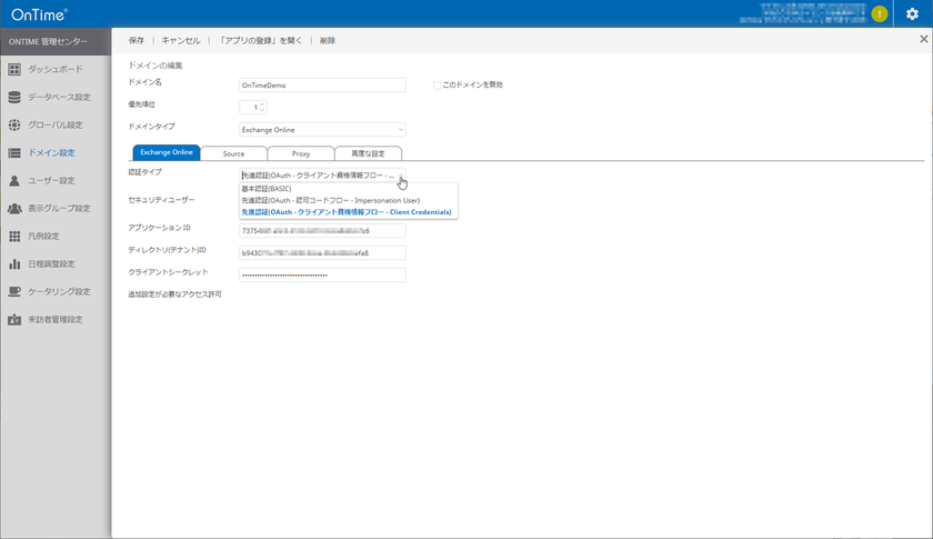 OnTimeはExchange Online含むMicrosoftのエンドポイント接続してリアルタイム同期を実現しています。今回新たにOAuth 2.0のフローの1つであるクライアント資格情報認可フローも選択肢の一つとして実装いたしました。同フローではユーザーの認証を行う必要はなくアプリの認証のみでトークンを取得して接続が可能となります。これにより従来の認可フローでは同期用アカウントを準備しImpersonationロールを付与する必要がありましたが必要なくなります。
