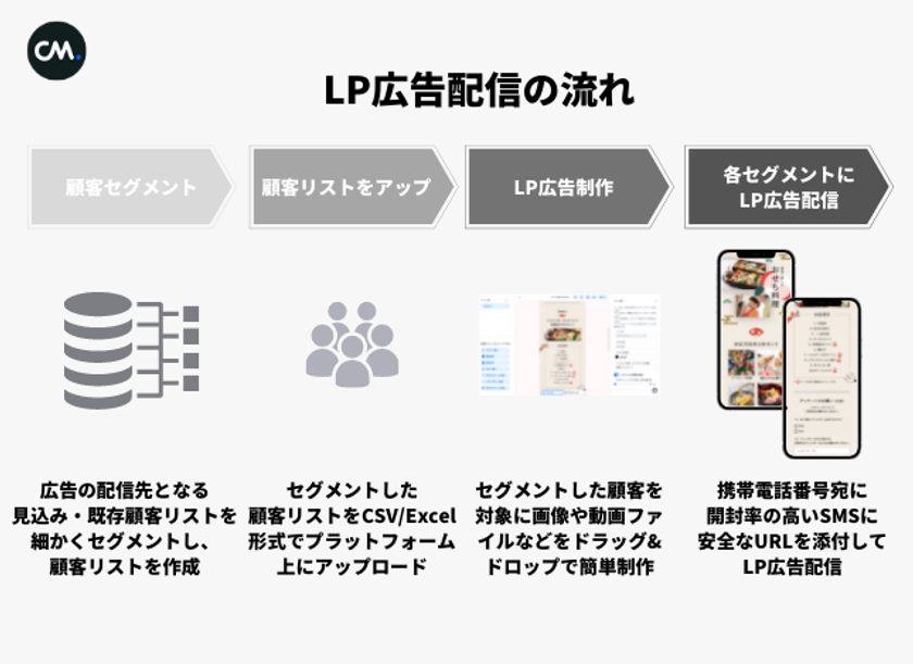 CM.com Japan 株式会社(所在地:東京都渋谷区、代表:Jeroen van Glabbeek、以下「当社」)は、ターゲット属性ごとに最適化したランディングページ(以下「LP」)広告を簡単に作成し、SMS(ショートメッセージサービス)で配信できる広告配信パッケージサービス「MMC(Mobile Marketing Cloud)」を2022年1月24日(月)から正式リリースします。