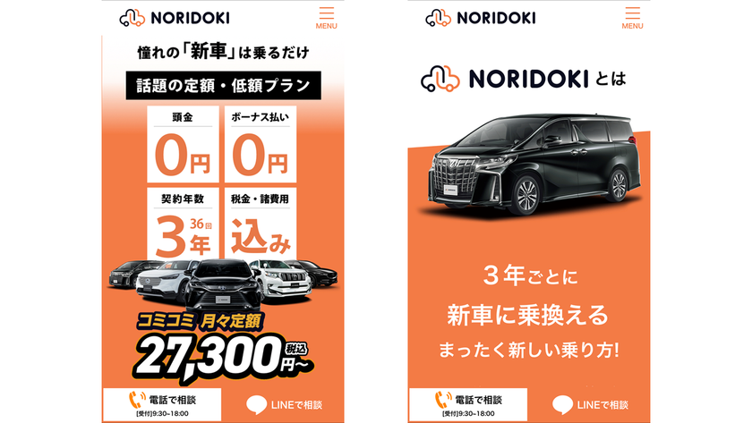 スマートフォン利用が身近になった現在、ユーザーの行動は日々変化しています。クルマの新しい乗り方を認知してもらうためには、ユーザーに寄り添った環境を用意する必要があります。そこで店舗の問い合わせページへ誘導することが重要になってきます。また、チラシ広告による来客数や問い合わせ数の伸び悩みの問題から、認知拡大や集客数アップを目的とした出口動線の確保のため、今回2つのリース商品「7MAX」、「NORIDOKI」に特化したLPサイトの運用を開始するに至りました。