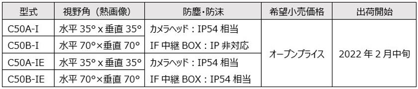 新製品は、240×240画素の高解像度な赤外線イメージセンサを搭載、可視カメラと一体化させ、わずか100gの小型・軽量を実現しました。付属の「インターフェース中継ボックス(以下、IF中継BOX)」からのPoE給電で動作しLAN接続でのシステム構築が可能です。IF中継BOXは、小型・軽量な“省スペースモデル”と、カメラモジュールと同等となるIP54相当の防塵防沫性能を備えた“耐環境モデル”の2種類を用意し、使用環境に応じて最適な製品を選択いただけます。