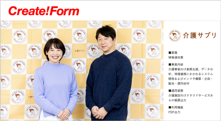 インフォテック株式会社(本社:東京都新宿区、代表取締役社長:山田 智次)は、介護施設や通所介護、障がい者支援施設向けの業務支援クラウドアプリを提供するITサービス企業、株式会社介護サプリ(本社:兵庫県神戸市、代表取締役社長:玉置 慎一)の、帳票ツール「Create!Form」導入事例を公開しました。